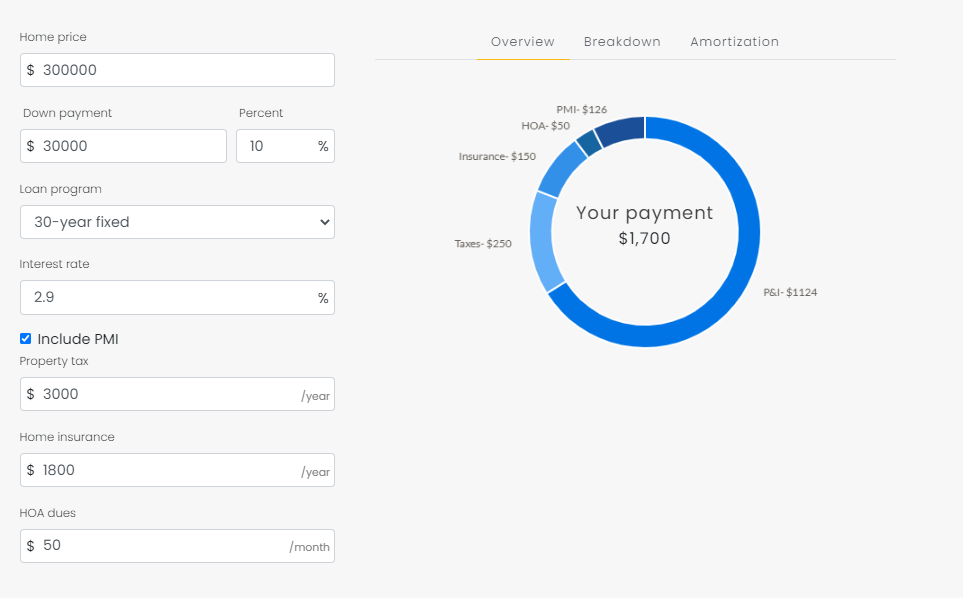 Mortgage calculators are a fast and easy way to learn about what your potential mortgage would look like. Use our mortgage calculator to calculate your estimated monthly mortgage payments based on your home price, down payment, loan program and interest rate. You can also include Private Mortgage Insurance (PMI) as well as property tax, home insurance, and HOA dues to help give you a more complete understanding of what your estimated payment amount will be.